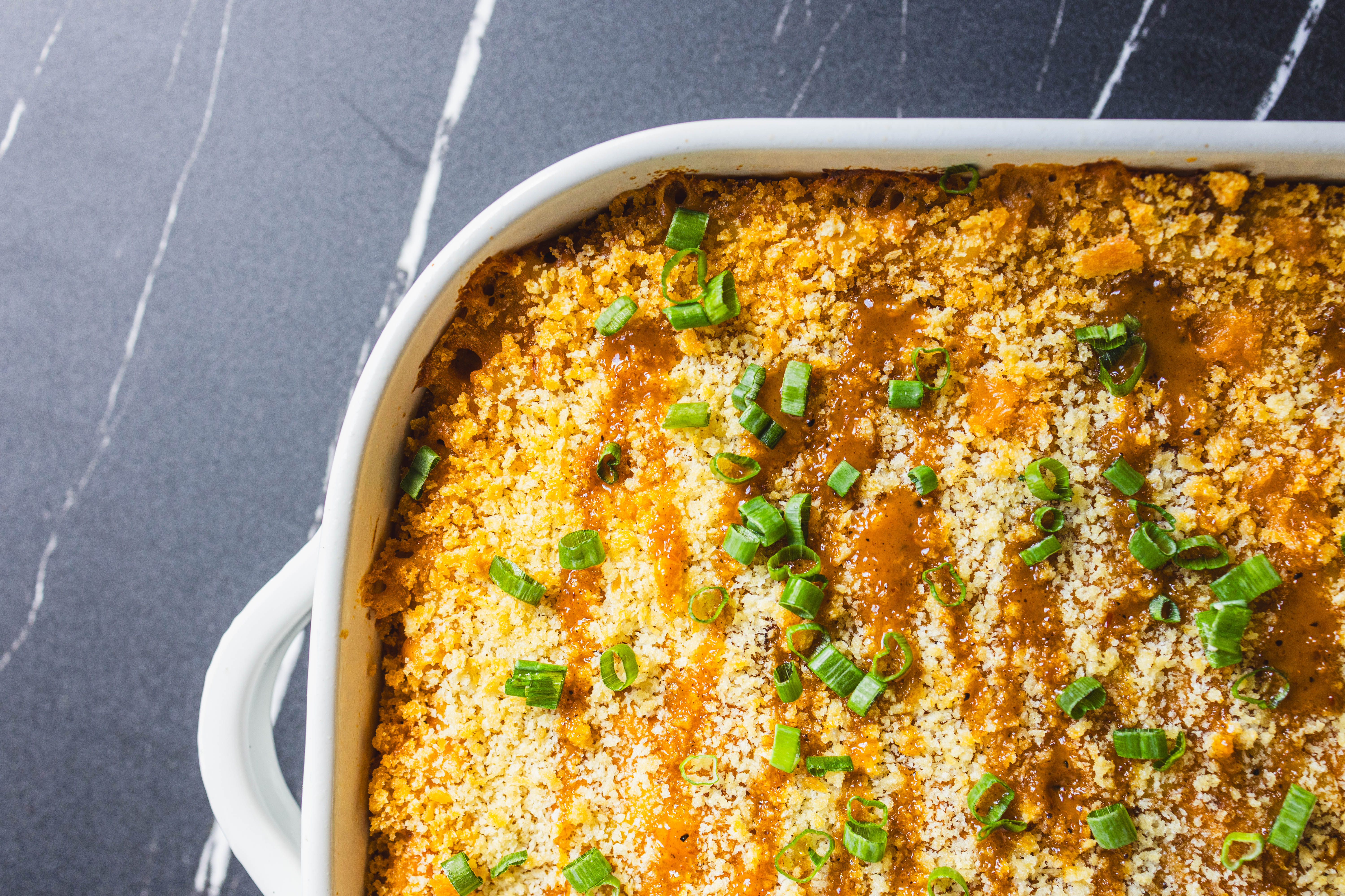 Step 16 -Serve the pulled pork bake drizzled with the barbeque sauce and garnished with the scallions.