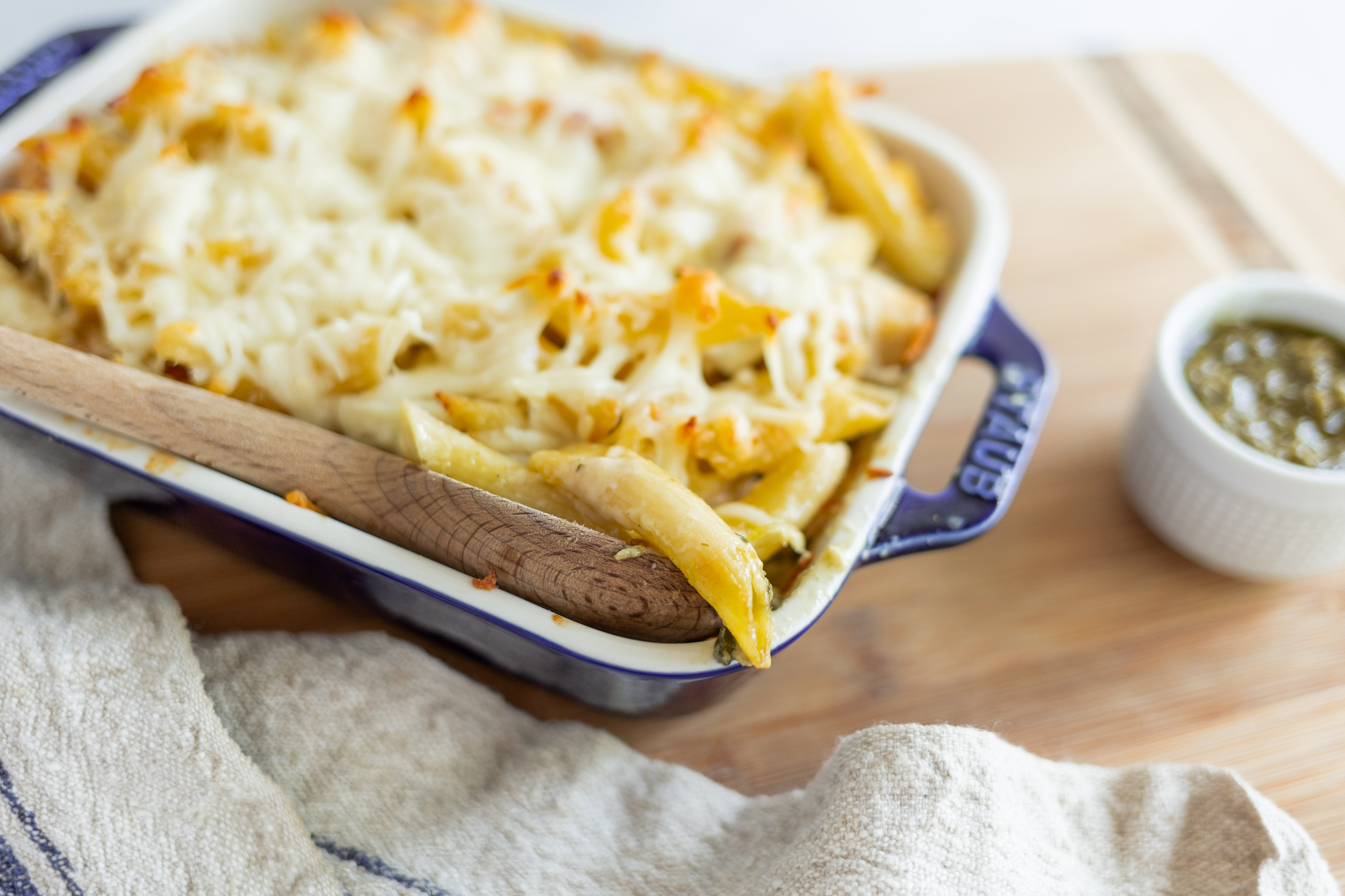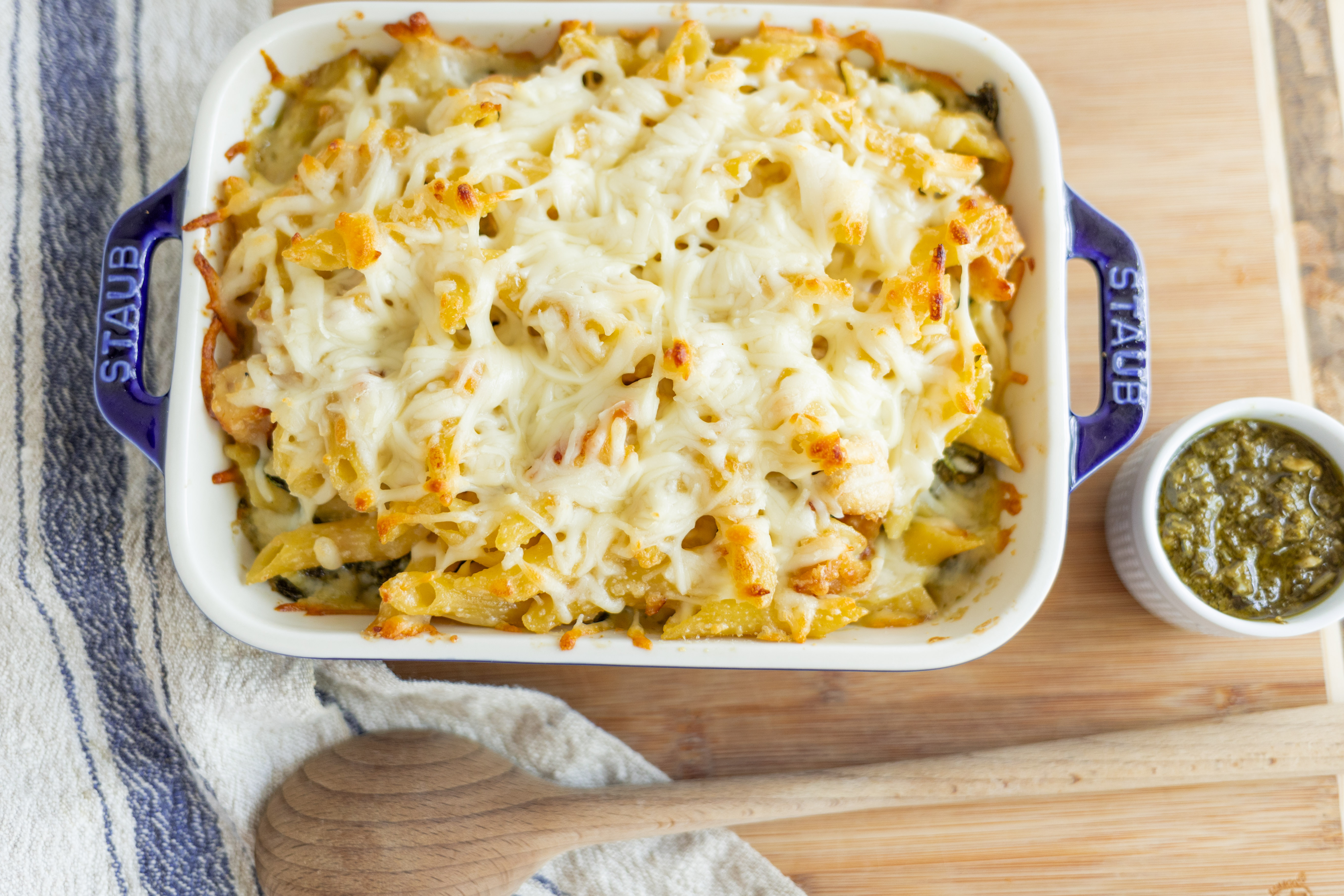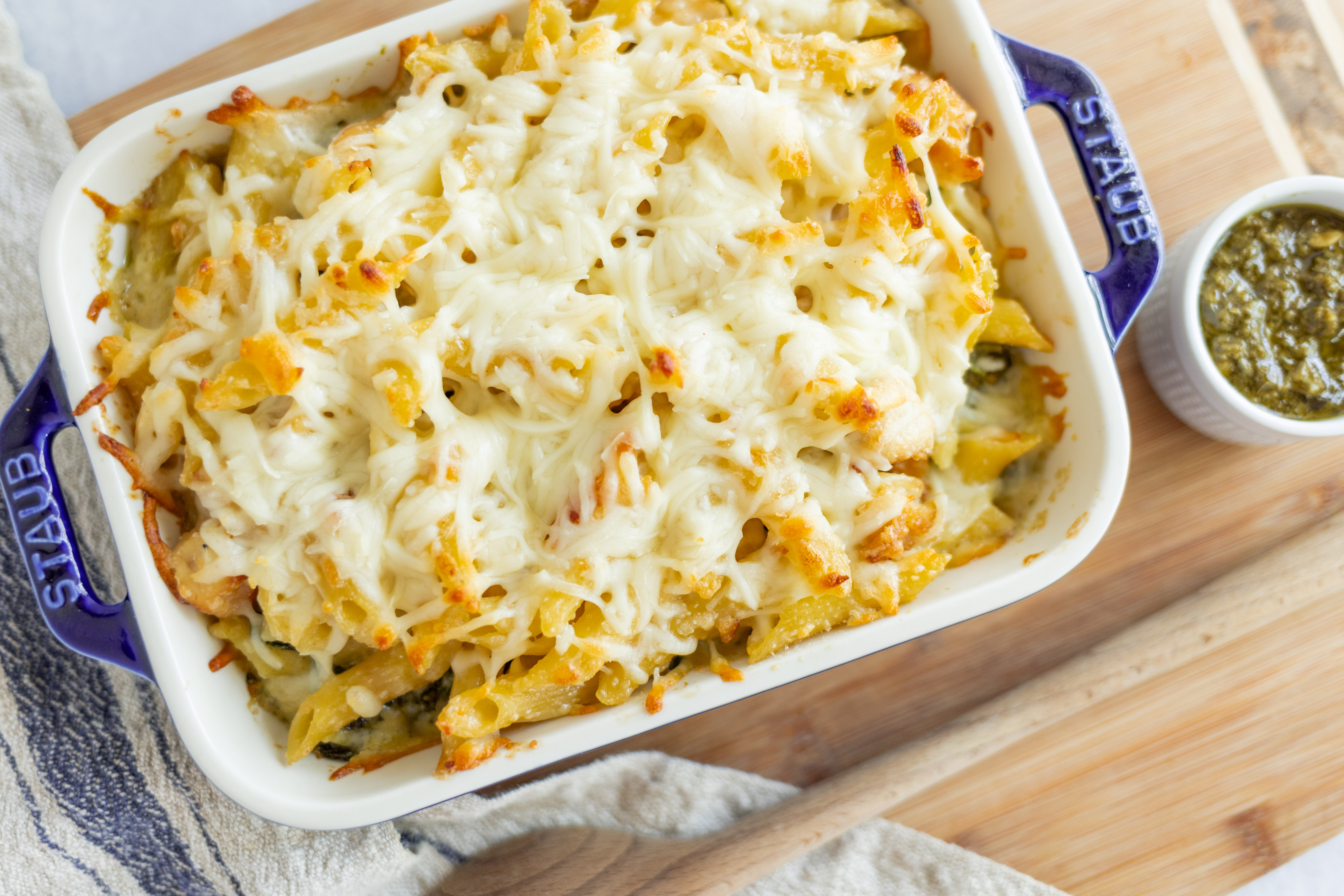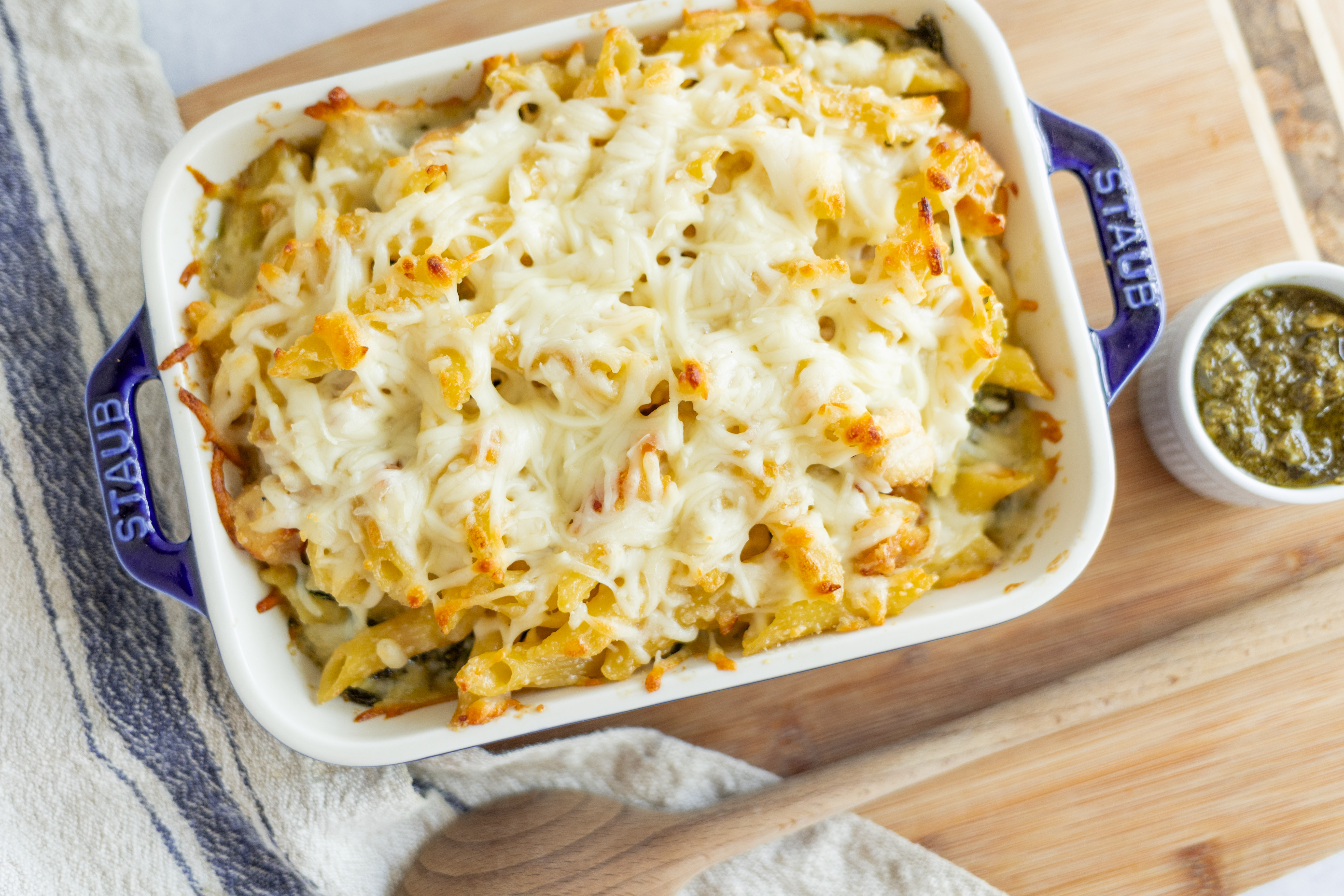 Get ready to dive into flavors like no other, that will keep you coming back for more! Crack Chicken Alfredo Bake has its namesake creamy, rich sauce infusing layers of tender spinach with herbaceous pesto and juicy chicken, with plenty of pasta for substance! Of course, it can't be the Crack Chicken Alfredo Bake without plenty, and we do mean plenty, of melty cheese on top! Take a crack at these big flavors!