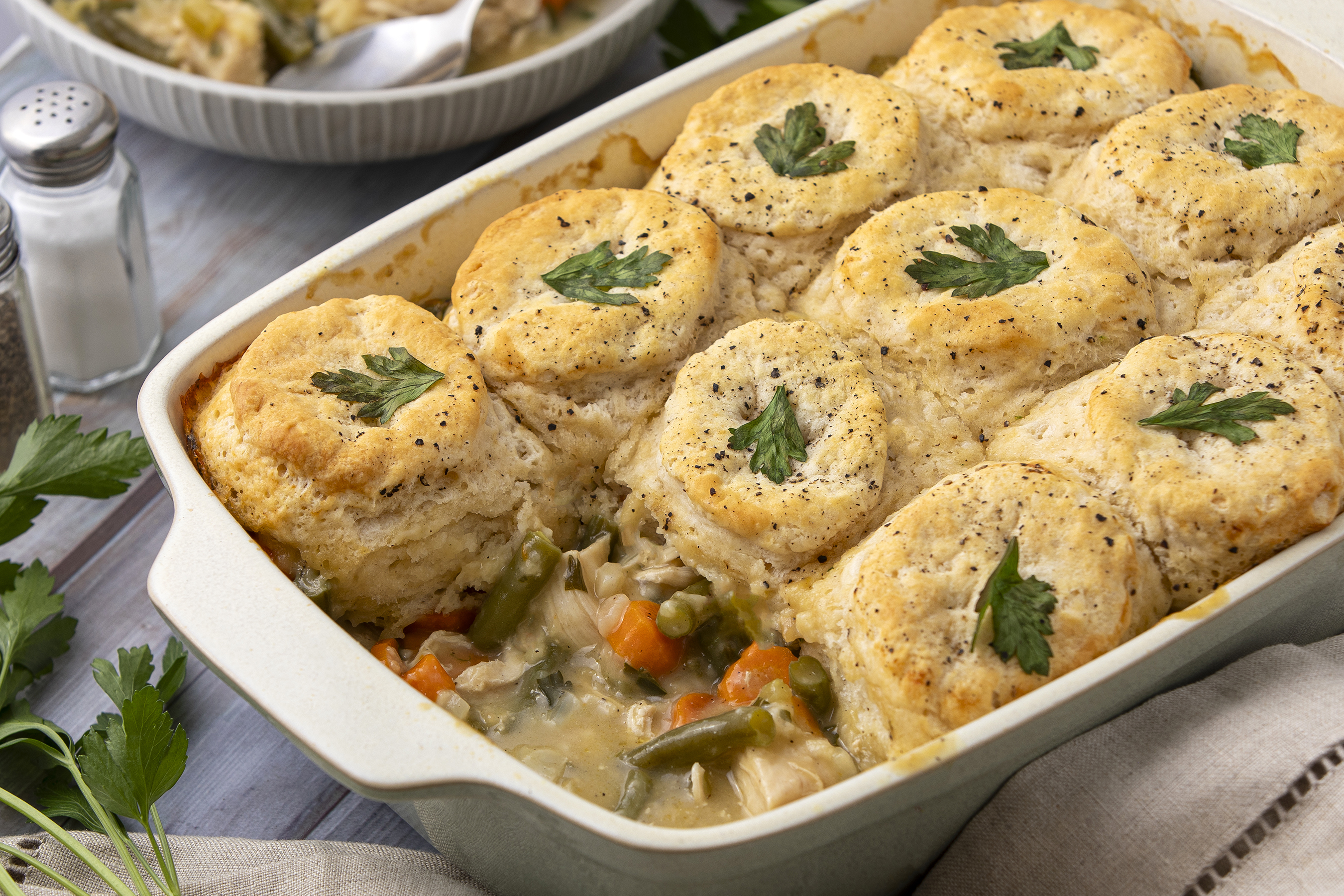 Known throughout the land as one of the best homemade dishes around, the Famous Biscuit Pot Pie is a star-making supper! With flaky, buttery biscuits on top (brushed with extra butter, naturally), the Famous Biscuit Pot Pie is filled with plenty of tender garden vegetables for brightness and refreshment; a perfect contrast to the savory, creamy sauce and the juicy bites of chicken. Dinner doesn't need to be humdrum; it can be a red-carpet affair with plenty of rustic charm! Just have a scoop and see!