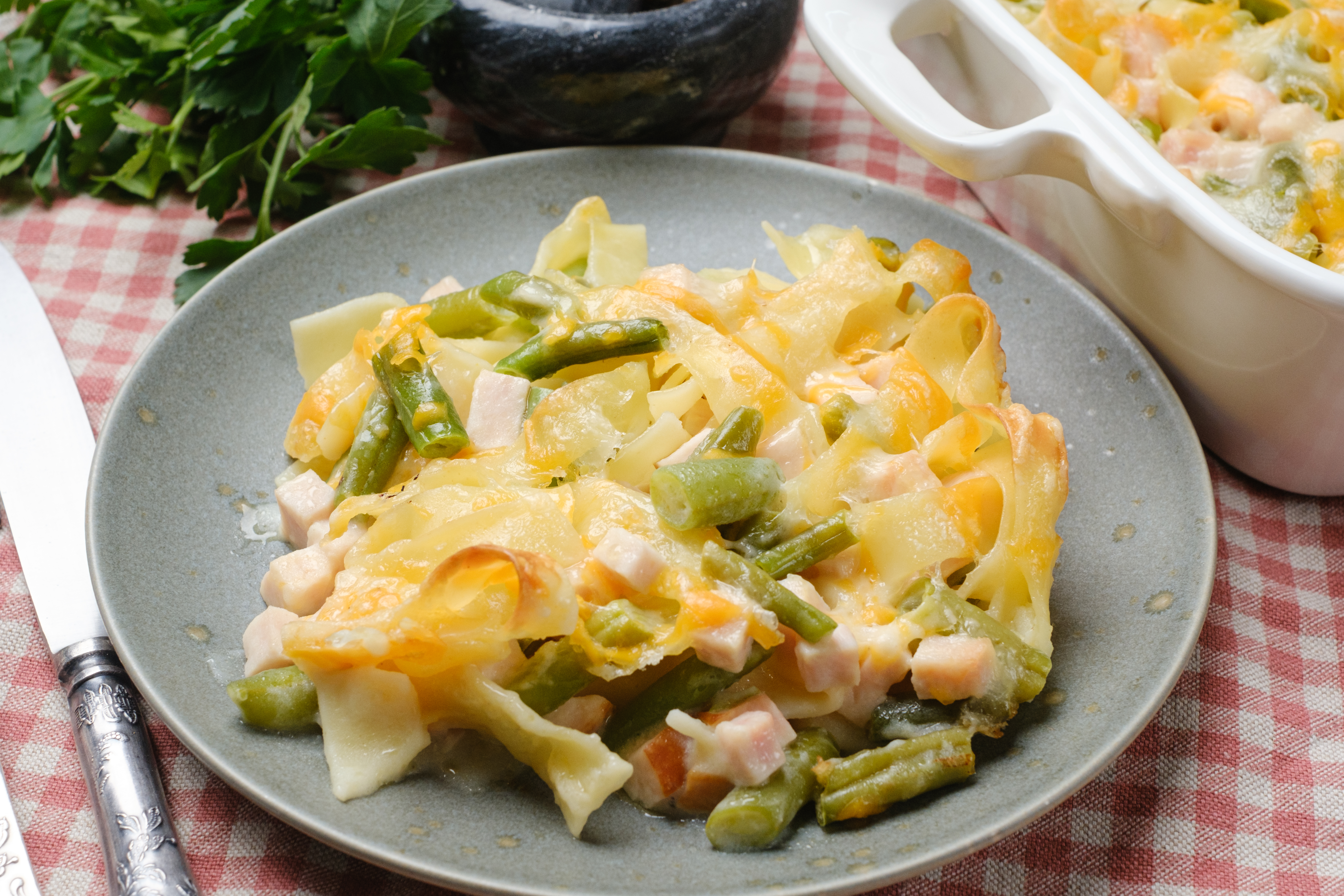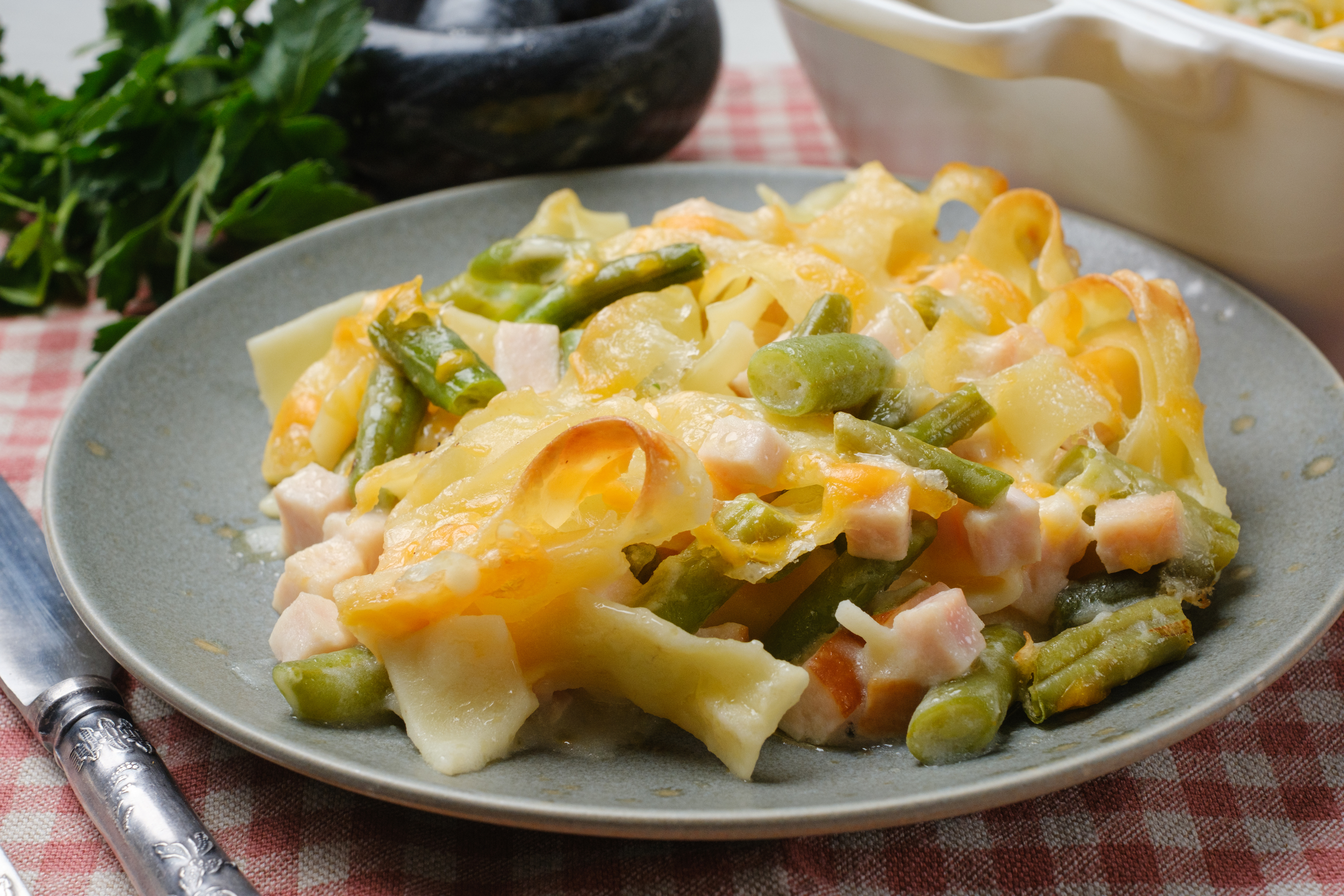This is Granny's Beloved Casserole. She makes it all the time—when guests or grandkids are over at her place, when she's heading to a potluck, or when she just needs a touch of home comfort. Every time she makes it, everything just feels right, like being bundled up on a cold night or sitting around the dinner table with loved ones. The egg noodles provide a buttery, tender bed for the savory ham, crisp green beans, creamy sauce, and melty cheese. Trust us, Granny's Beloved Casserole will be beloved by your family as well!