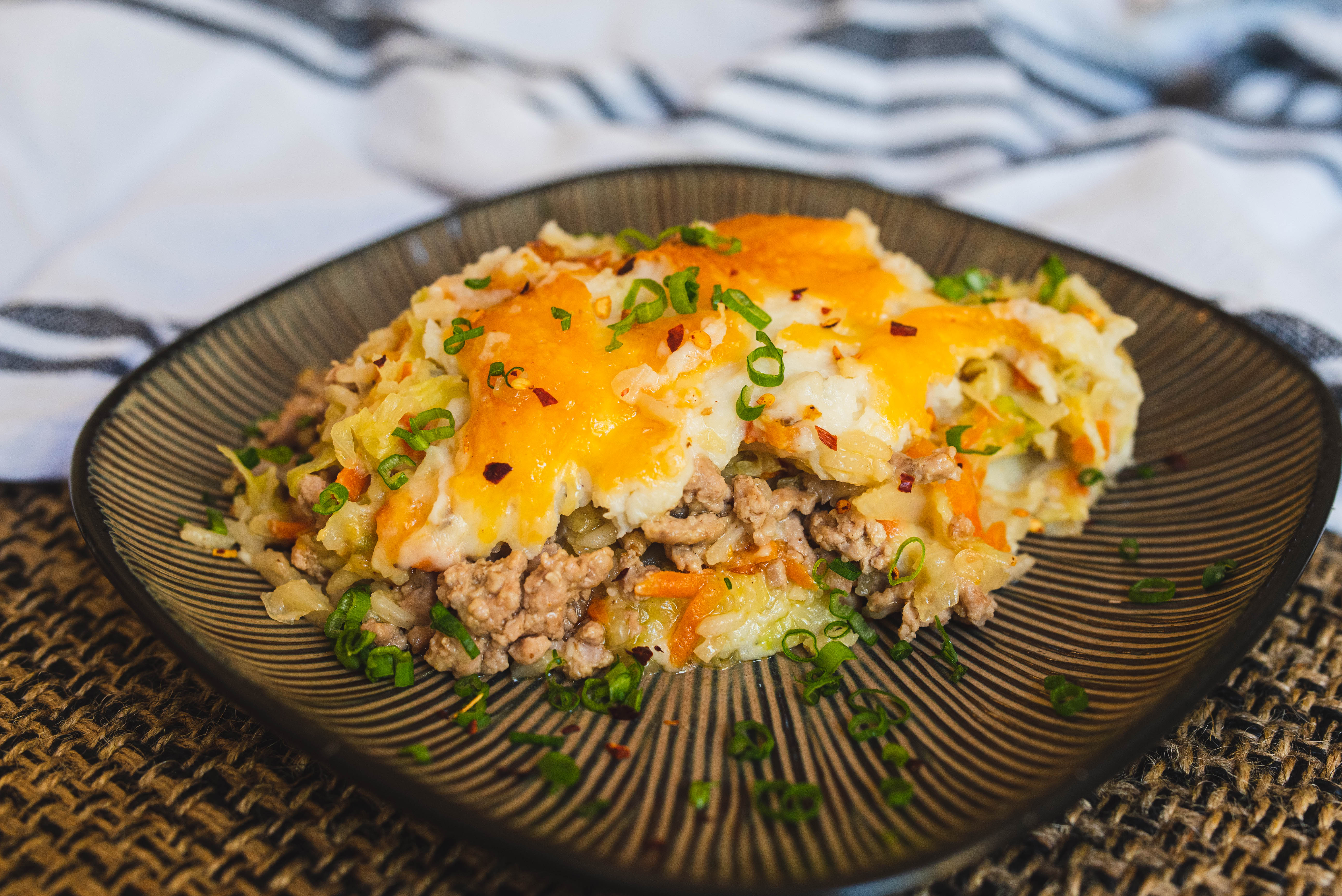 Step 12 -Spoon or pipe the mashed potatoes over the top of the cabbage mixture layer.