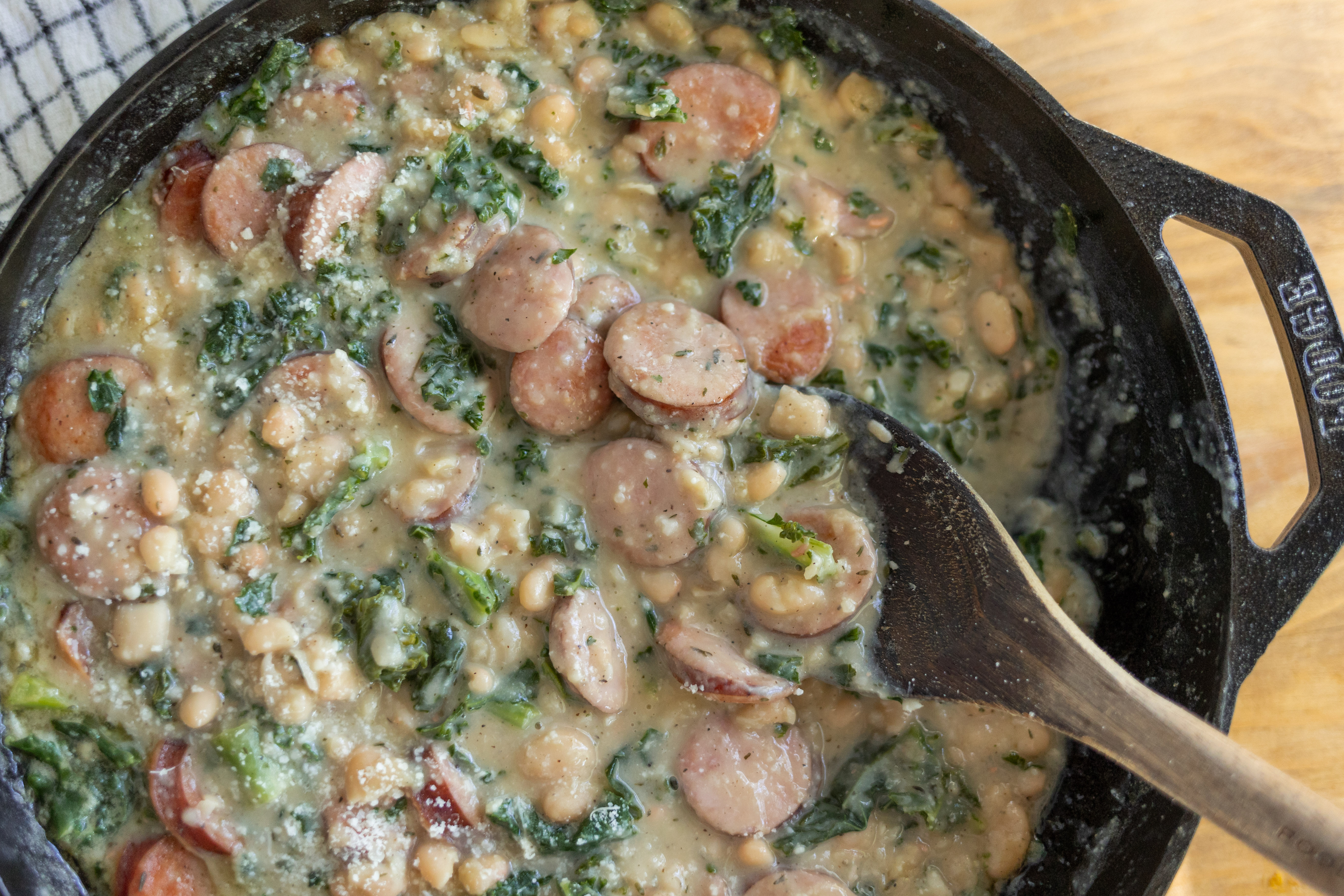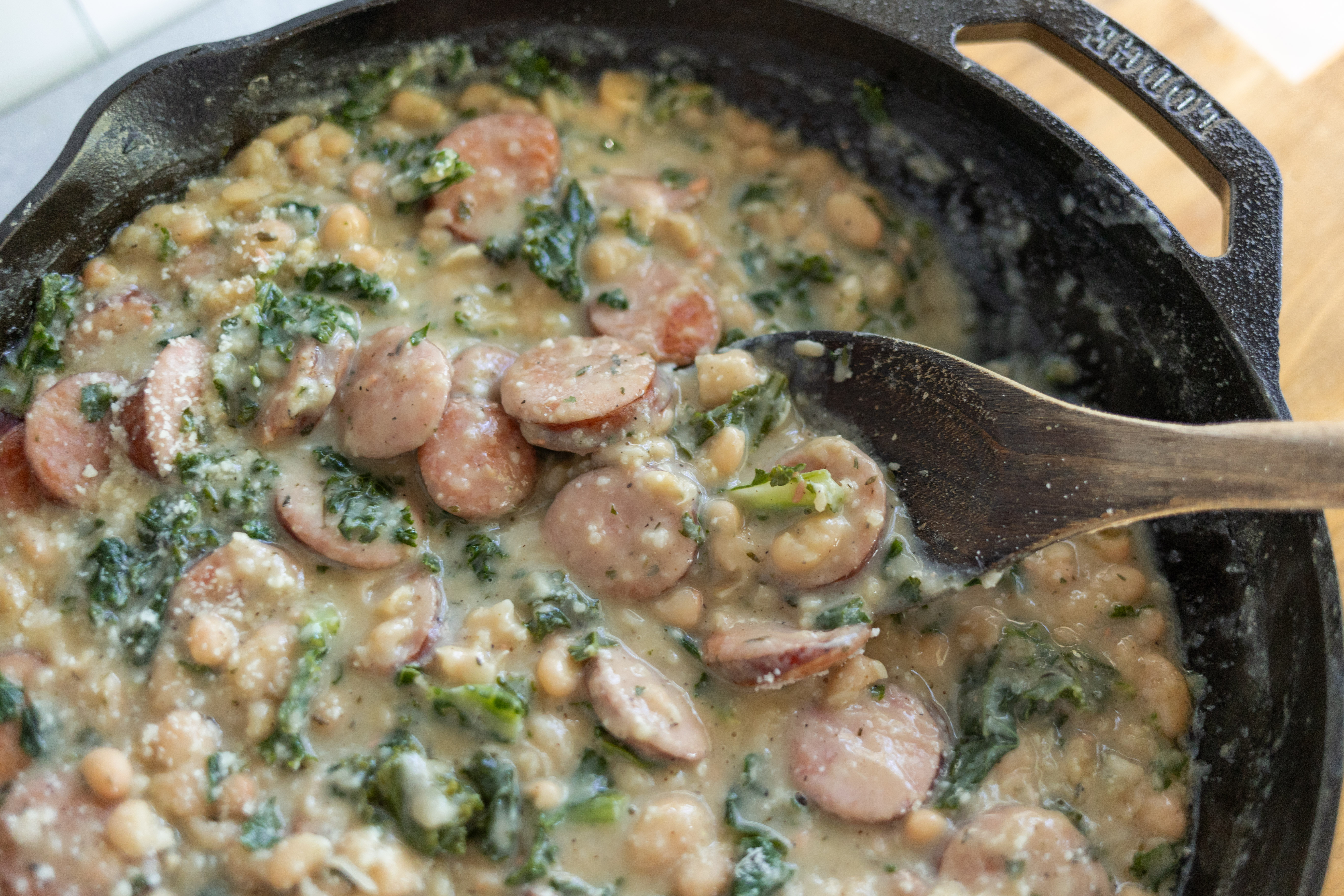 If time and budget are tight, but a hearty meal is needed, this meal will deliver, indeed. Nom-Nom Skillet is a one-skillet-wonder that will leave you wondering why you've never tried it before. Smoked sausage is cooked to fork-tender loveliness and joined with plenty of beans, kale, and parmesan for an amazing flavor combo. Creamy, filling, and oh, so easy, Nom-Nom Skillet will set a delicious meal in motion leaving just two words on your mind... nom, nom! Enjoy!