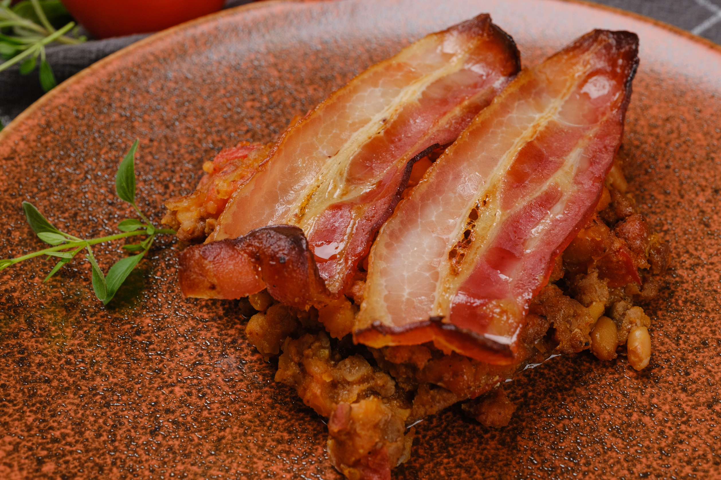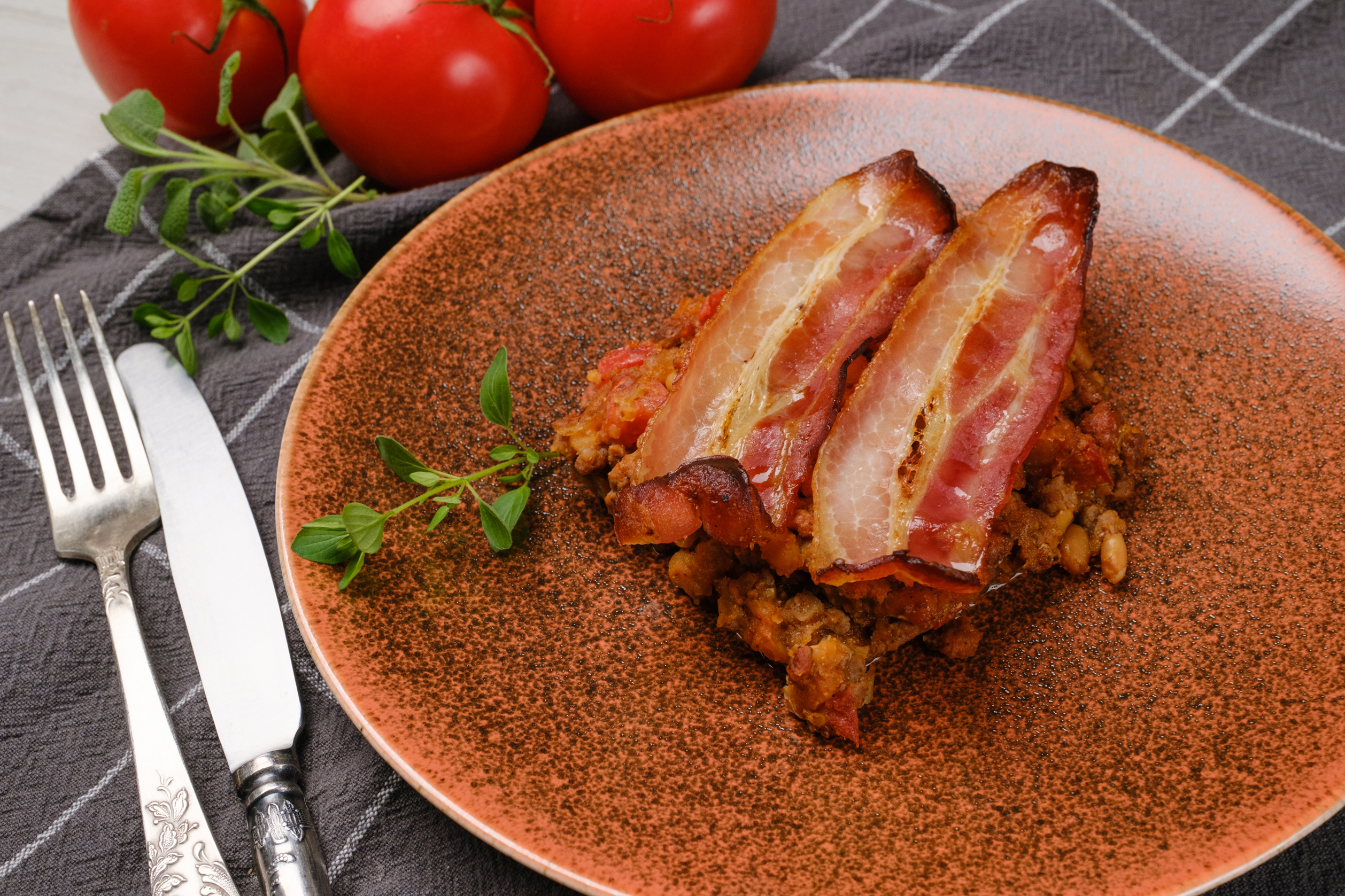Step 7 -Pour the beef mixture into the prepared casserole dish and arrange the bacon slices on top.
