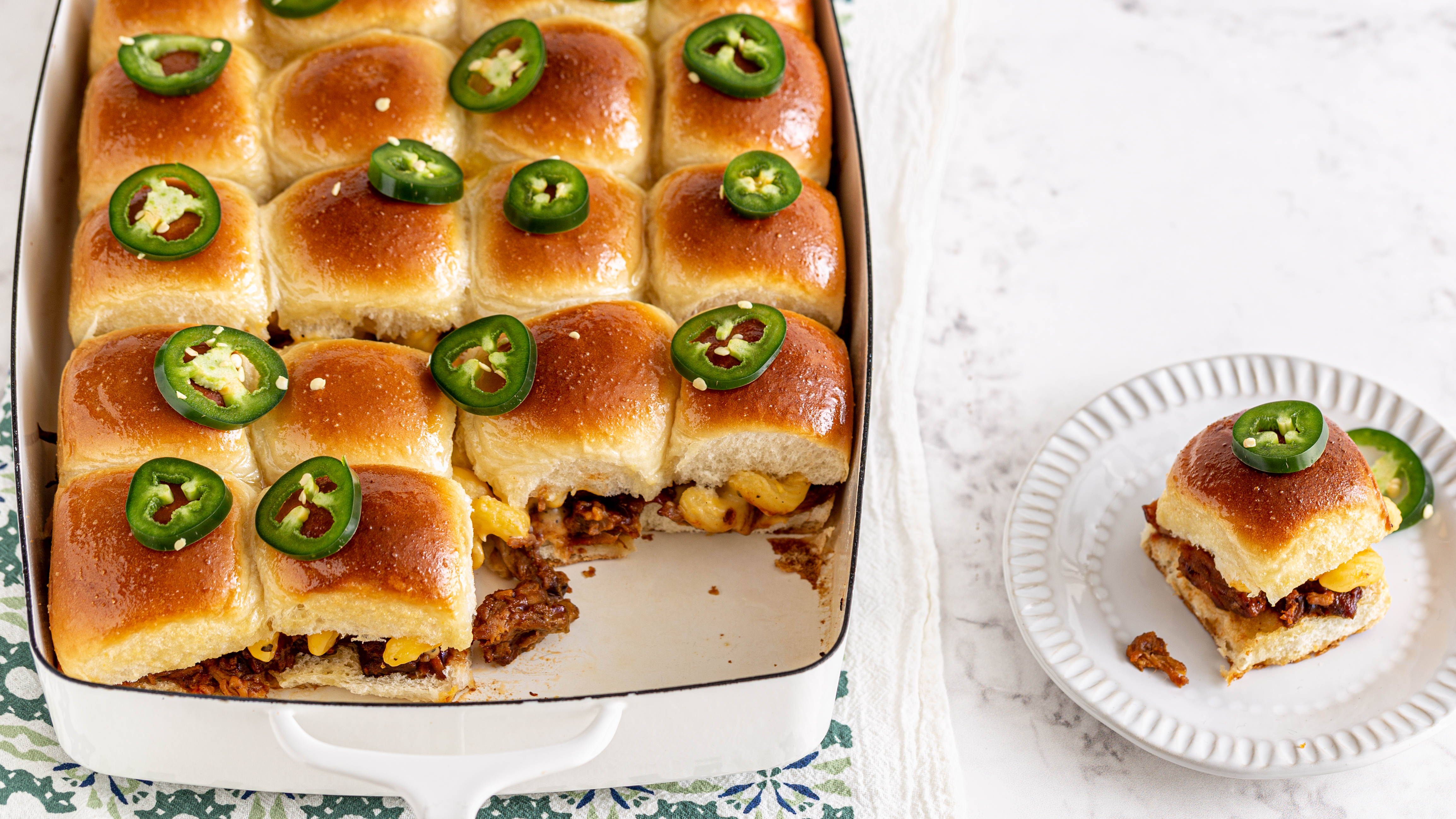 Everything about Pork Sliders is just amazing. The sweet pillowy rolls, brushed with a tangy mustard and butter mixture, the juicy, smoky, savory barbeque pork, the homemade mac and cheese helping to fill out each mini sandwich and add cheesy, creamy goodness! Mmmm, it's like a whole cookout in each bite. The hot pepper slices on top only add to the summer delight that are these Pork Sliders. Feeding a crowd has never felt so simple, and the results have never felt so successful!